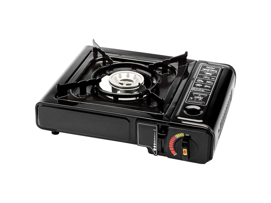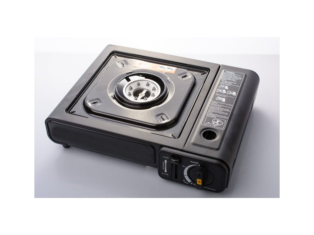 Nezbytnost pro dovolenou pod stanem, kempování a zahradu - oblíbený přenosný plynový vařič Arise TD-9396 v plastovém kufříku.