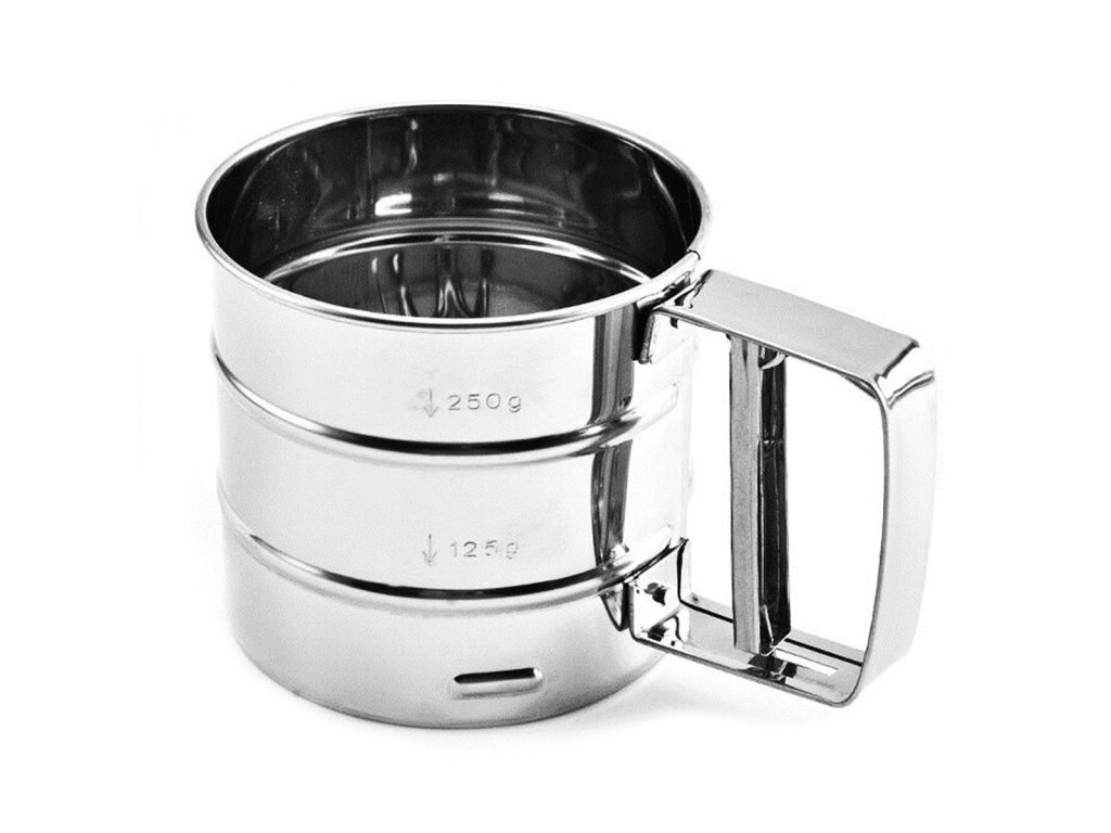 Praktické nerezové sítko na mouku a moučkový cukr Bohmann BH-7740 s mechanickou rukojetí. Jednoduché ovládání jednou rukou.