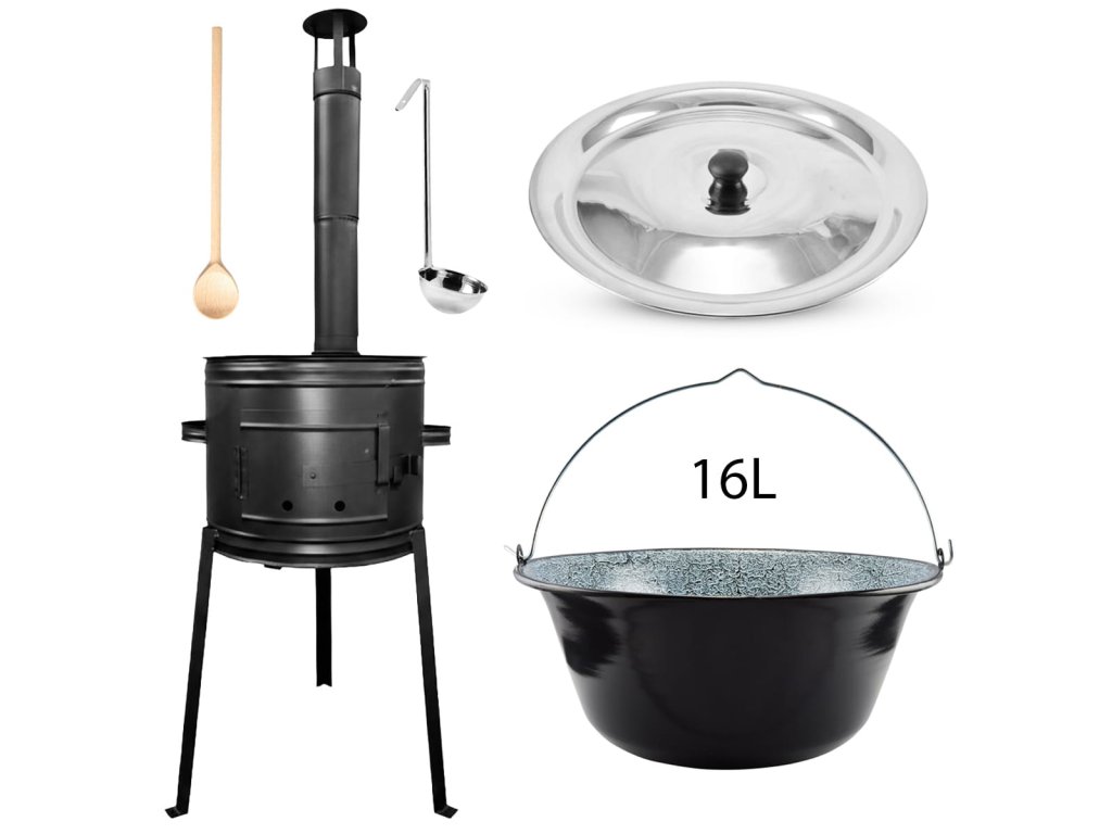 Kotlíková souprava na guláš 16L s vysokou kotlinou od Perfect Home je ideální pro venkovní vaření. Obsahuje železnou kotlinu, smaltovaný kotlík, poklici, komín, vařečku a naběračku.