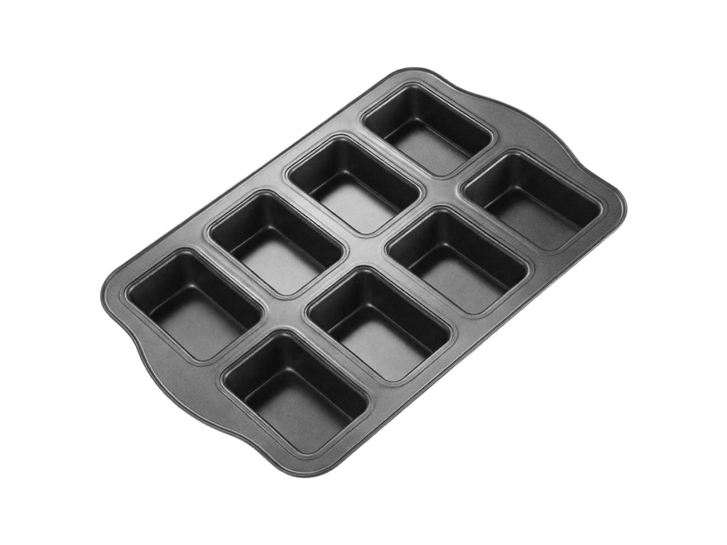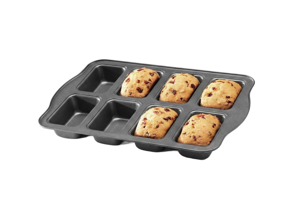 Všestranná forma na pečení s nepřilnavým povrchem o rozměru 36×24×3,5cm. Má osm přihrádek na mini chlebíčky či dortíčky, široké rukojeti a zahnuté okraje pro bezpečné pečení. Vhodná do trouby i mrazničky.