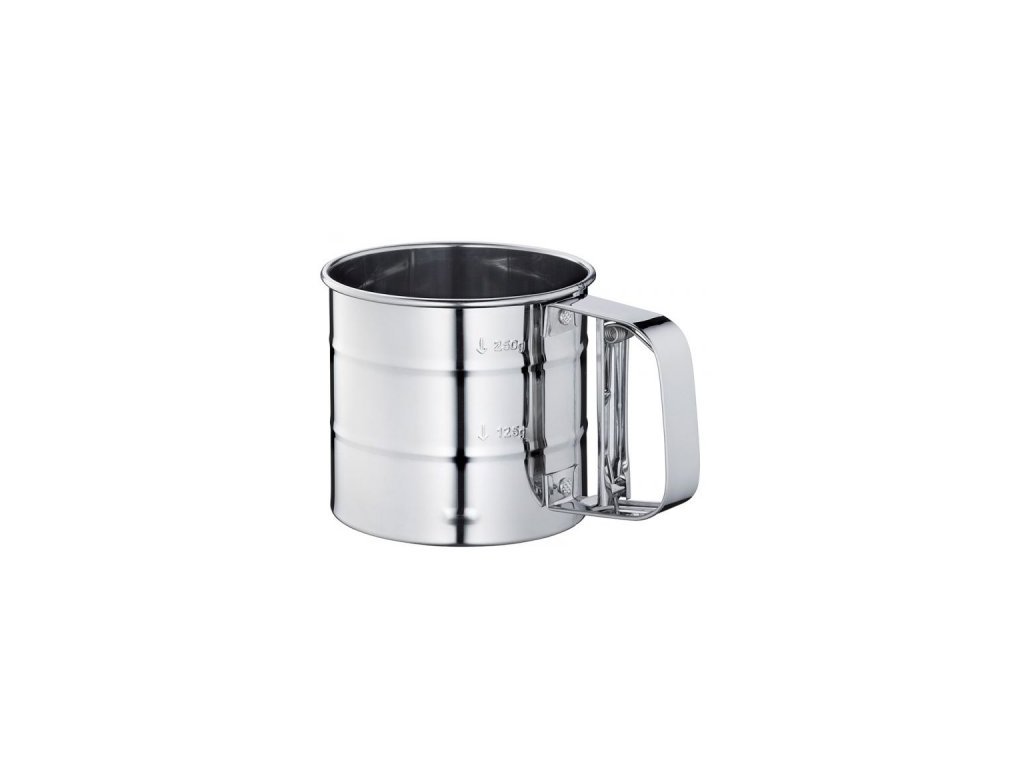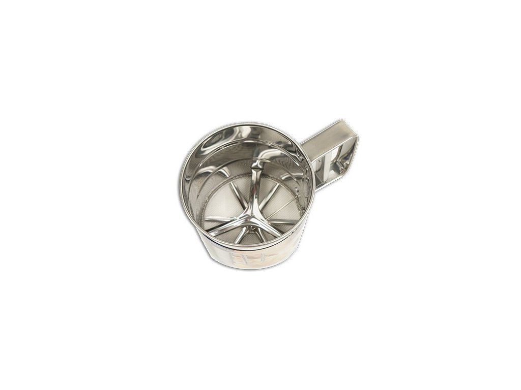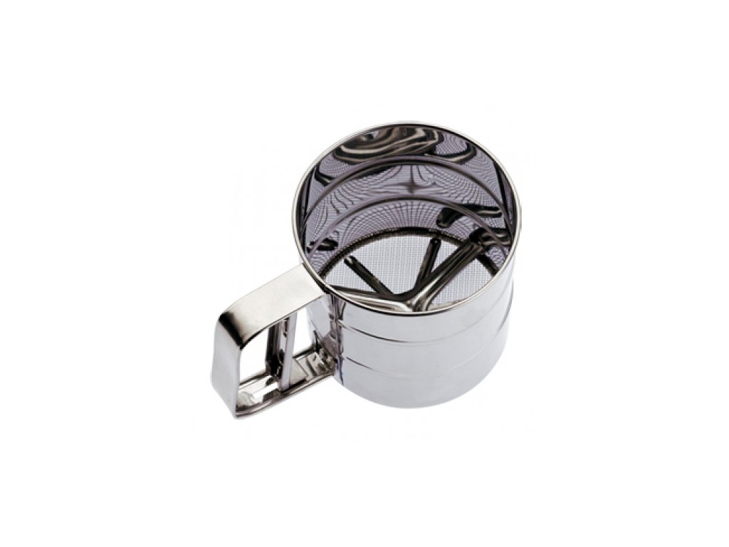 Kuchyňské mechanické síto se směšovačem je vyrobeno z nerezové oceli a je určeno k vysévání mouky, moučkového cukru a jiných sypkých materiálů. Sítko je vybaveno mechanickým systémem pro snadné setí.