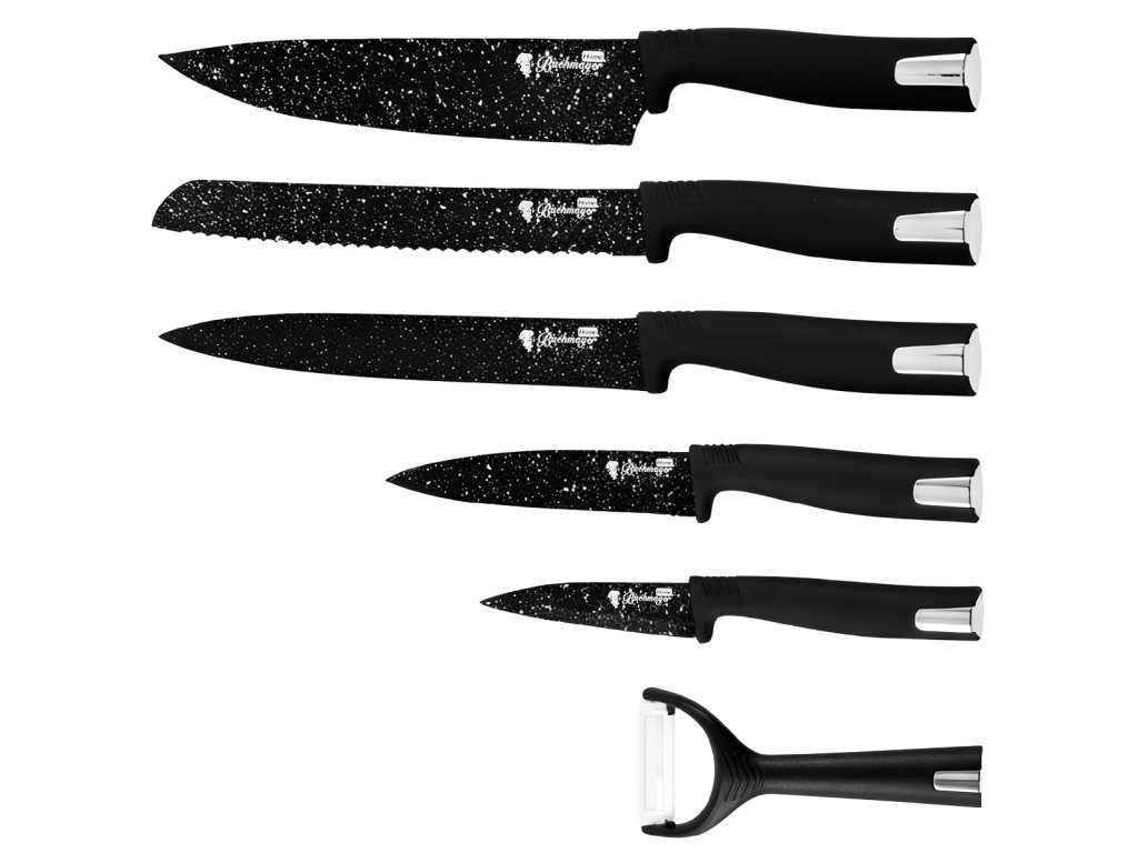 Je moderní sada kuchyňských nožů s granitovým povrchem čepelí a ergonomickými plastovými rukojeťmi v černé barvě. Kvalitní nerezová ocel zajišťuje ostrý, přesný řez a dlouhou životnost. Praktická a elegantní sada nožů do kuchyně pro každodenní vaření i sváteční příležitosti – skvělé také jako dárek.