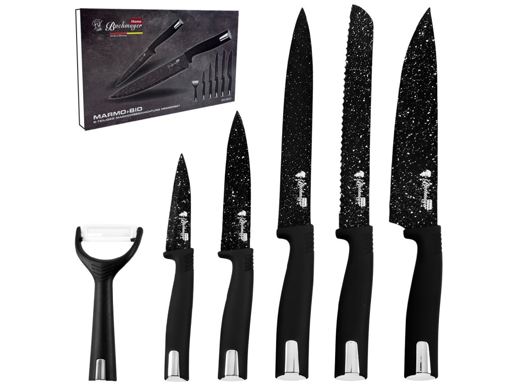 Sada kuchyňských nožů 6 ks Bachmayer BM-6647: nerez ocel, granitový povrch, černé rukojeti. Obsahuje kuchařský, porcovací, chlebový, univerzální, malý nůž a škrabku. Ergonomický design pro přesné krájení.