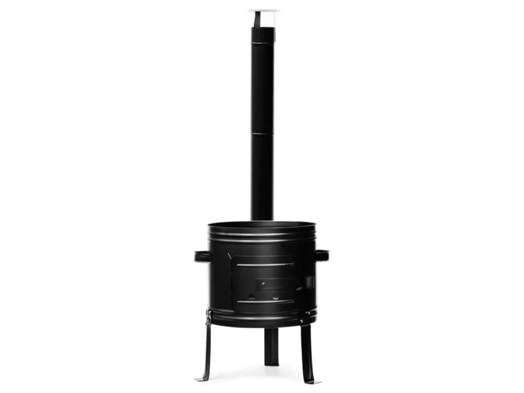 1. Železná kotlina s komínem a kolenem. Vhodná pro 14 L kotlíky. Vnější průměr je 38 cm, délka nohou 23 a výška 60 cm.